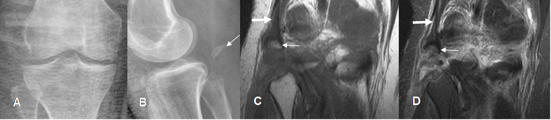 A: Rx AP  y B: RM coronal en STIR.  Fragmento óseo en la parte medial de la rodilla,  paralelo al cóndilo femoral.