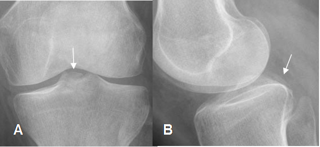 A: Rx AP y B: Rx lateral. Presencia de fragmento óseo central y de localización posterior, por avulsión sobre la inserción del LCP.