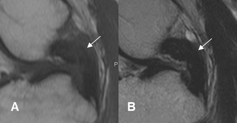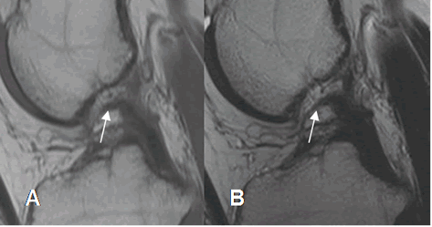 A: RM sagital en T1 y B: RM sagital en T2. Solución de continuidad del LCP en su tercio proximal, por ruptura.