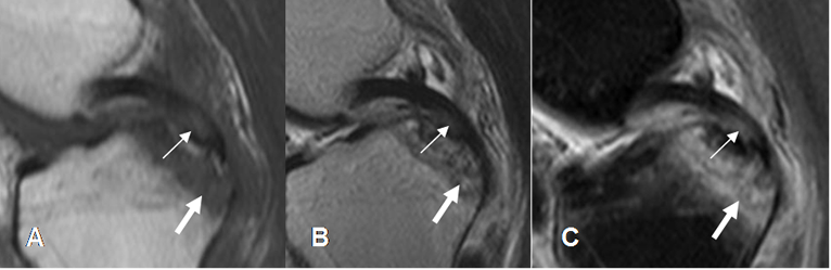 A: RM sagital en T1, B: RM sagital en T2 y C: RM sagital en STIR. Zona de aumento en la señal en el tercio distal del LCP, con ruptura de algunas fibras por esguince GII. (Flecha delgada).  Además hay contusión en la parte posterior de La tibia. (Flecha gruesa).