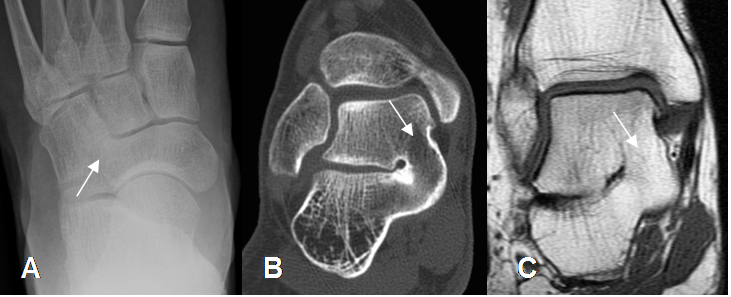 B: TAC coronal y C: RM T1 coronal. Coalición ósea talocalcánea, en la parte medial.