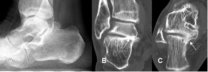 B: TAC reconstrucción coronal y B: TAC axial. Coalición talocalcánea ósea interna.
