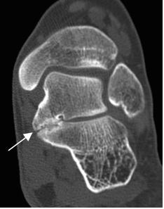 A: TAC reconstrucción coronal. Disminución del espacio talocalcáneo medial, con esclerosis e irregularidad de los bordes, por coalición fibrosa.