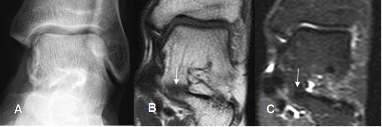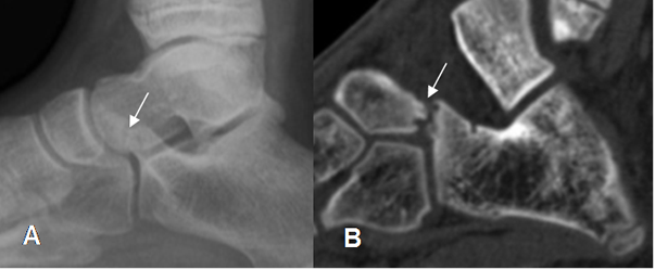 A: Rx lateral y B: TAC reconstrucción sagital del tobillo. Signo del oso hormiguero, por