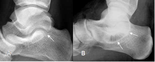 A y B: Rx lateral del tobillo. Signo de la “C” incompleto, como hallazgo normal en A. En B el signo de la “C” es completo, por coalición talocalcánea.