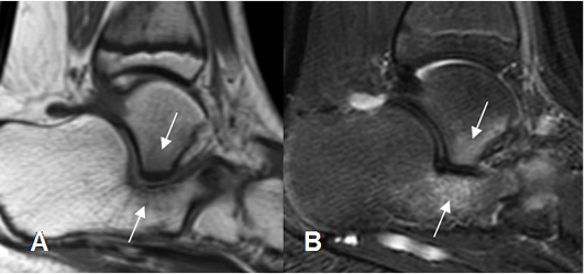 A: RM sagital en T1 y B: RM sagital en STIR. Coalición talocalcánea cartilaginosa, con edema óseo asociado.
