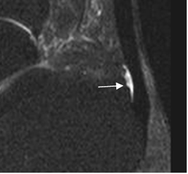 B: RM sagital en T2 y C: RM sagital en STIR. Solución de continuidad del tendón a nivel de su inserción, con cambios inflamatorios agudos en los tejidos vecinos.