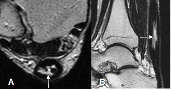 A: RM axial en T2. Engrosamiento del tendón, con pérdida de la concavidad anterior.