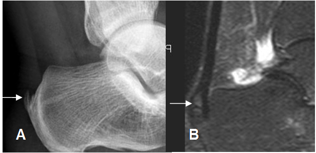 A: Rx lateral. Calcificación sobre la inserción del tendón de Aquiles, por tendinitis crónica.