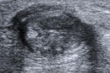 Ecografía vista axial. Engrosamiento del tendón con alteración de su ecogenicidad, por inflamación crónica.