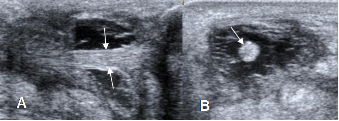 A: Ecografía vista sagital y B: vista axial. Adelgazamiento del tendón por ruptura parcial, el cual está rodeado por líquido.