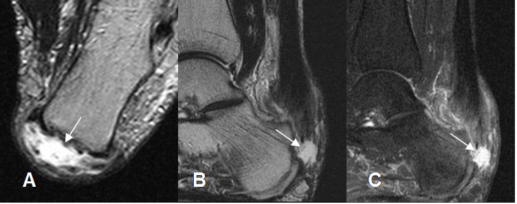 A: RM axial en T2. Area hiperintensa sobre la inserción del aquiles, por ruptura.