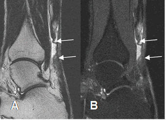 Diferenciar clínicamente una ruptura parcial, de una tendinosis crónica es difícil. Por imagen una ruptura parcial se asocia con edema subcutáneo, hemorragia en la grasa pre-aquiliana e intratendinosa. En la tendinosis generalmente no se encuentran cambios inflamatorios, ni hiperintensidad del tendón. (1).