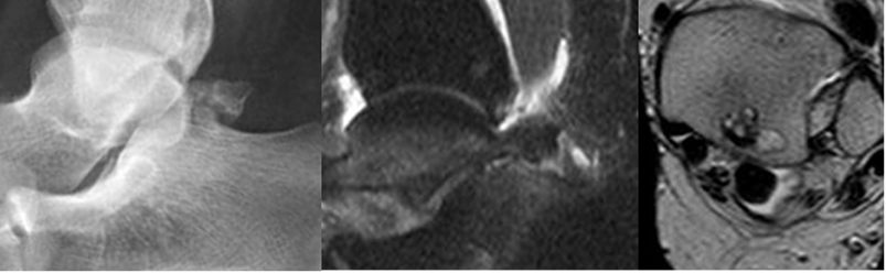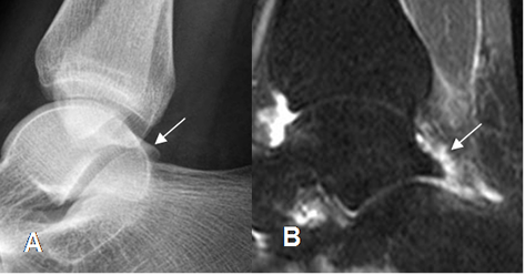 A: Rx lateral y B: RM sagital en STIR. Os trígono hipertrófico, que ocasiona pinzamiento y signos de sinovitis.