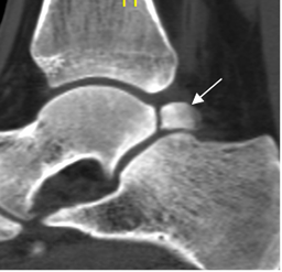 La RM se utiliza para hacer el Dx y muestra el edema óseo de las estructuras comprometidas, por contusión o fracturas ocultas, cambios inflamatorios en los tejidos blandos, sinovitis en el receso posterior de la articulación subtalar y tenosinovitis del flexor largo del hallux. (15). (Fig 99, 100, 101 y 102). Como hallazgo asociado, se puede encontrar engrosamiento de los ligamentos posteriores del tobillo. (18).