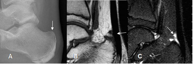 A: Rx lateral y B: TAC reconstrucción sagital. Prominencia en la parte posterior del talo, que comprime los tejidos blandos y corresponde a proceso de Stieda.
