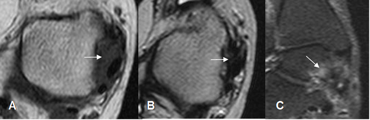A: RM axial en T1, B: RM axial en T2 y C: RM coronal en STIR. Tejido inflamatorio hipointenso en T1 e hiperintenso en T2 y STIR, en la parte posterolateral del tobillo.