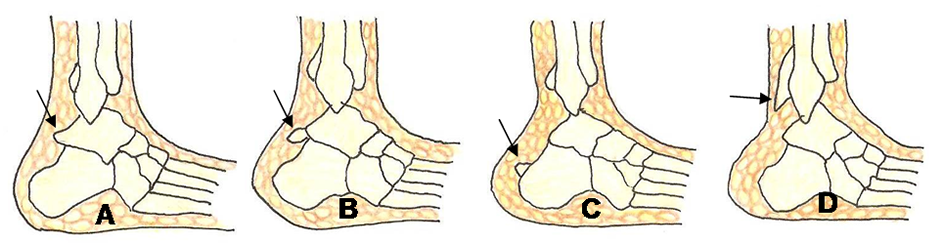 A: Proceso de Stieda. B: Os trígonum. C: Deformidad de Haglund y D: Prominencia de la plataforma tibial.