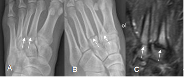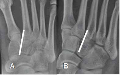 A: Rx AP del pie. Alineación entre el 2º metatarsiano y la cuña medial.