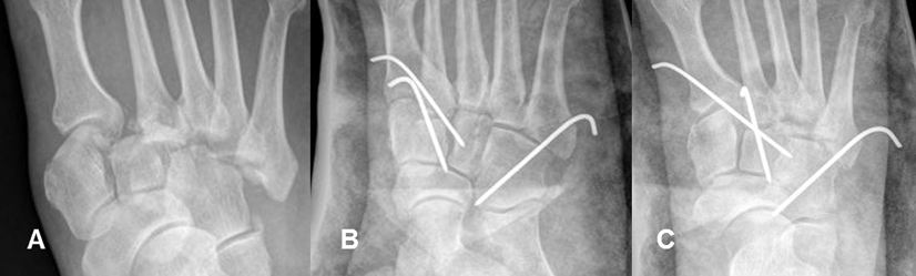 B: Rx oblicua y C: Rx AP. Reducción de las luxaciones, con clavos de Steiman.