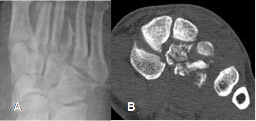 A: Rx AP y B: Rx oblicua. Fracturas no desplazadas en las bases del 2º y 3º