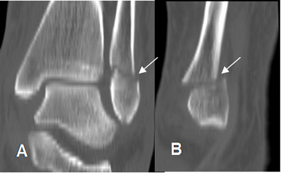 A: TAC reconstrucción coronal y B: TAC reconstrucción sagital. Fractura en sentido transverso del maleolo externo, levemente desplazada.