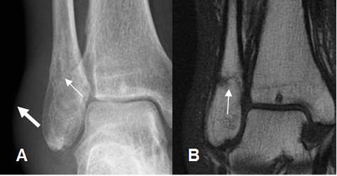 A: Rx AP y B: RM corte coronal en T2. Fractura no desplazada del maléolo externo (Flecha delgada), con edema de tejidos blandos. (Flecha gruesa).