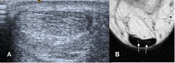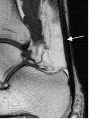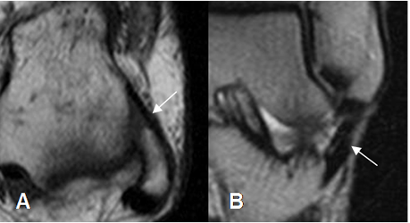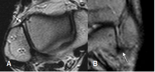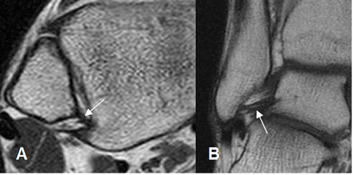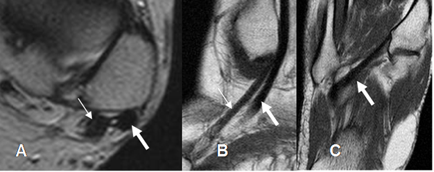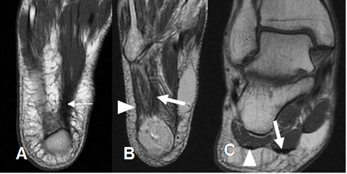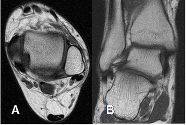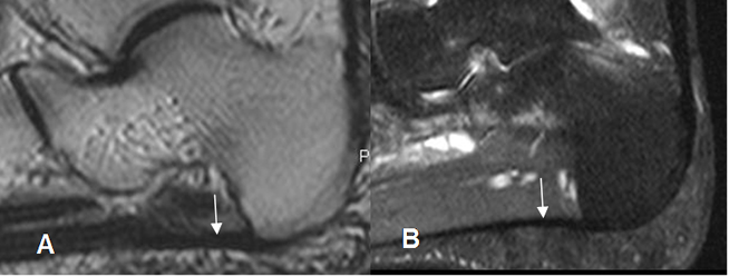 A: RM axial en T2 y B: RM sagital en T1. Peroneo corto (Flecha delgada) y peroneo largo (Flecha gruesa).