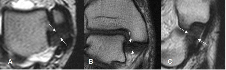A y B: RM axial en T1. Ligamento tibioperoneo anterior (flecha delgada) y tibioperoneo posterior (flecha gruesa).