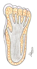 La fascia plantar se origina en la tuberosidad del calcáneo y divide en 3 ramas principales medial, central y lateral. La central se subdivide en 5 ramas, que se insertan en las falanges proximales de los dedos. Las ramas medial y lateral se insertan en las bases del 1º y 5º metatarsianos. (6). En secuencias sagitales y coronales, se aprecia como una estructura delgada e hipointensa, de 3 a 4 mm de espesor a nivel de su origen en el calcáneo. (1). (Fig 18, 19, 20 y 21).