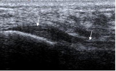 En ecografía, los ligamentos son estructuras lineales e hipoecoicas, con  un espesor menor a 2 mm. (4). (Fig 9 y 15).