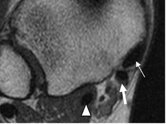 A y B: RM axial en T1 y C: RM coronal en T1. Rama medial (Flecha delgada), central (Flecha gruesa) y lateral (Cabeza flecha).