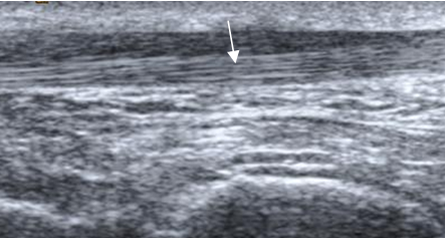 Fig 27. Tendón tibial posterior normal en ecografía, corte sagital.