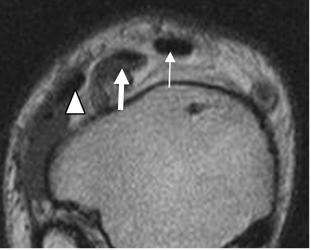 RM axial en T1. Tibial anterior (Flecha delgada), extensor largo del hallux (Flecha gruesa) y extensor largo de los dedos (Cabeza flecha).