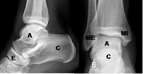 A: Rx lateral y B: Rx AP.  C: Calcáneo. A: Astrágalo o talo. E: Escafoides. MI: Maléolo interno. ME: Maleolo externo.