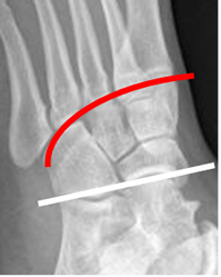 Rx oblicua. Articulación de Chopart: Línea blanca y de Lisfranc: Línea roja.