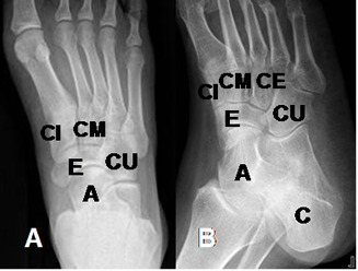 A: Rx AP y B: Rx Oblicua.  C: Calcáneo. A: Astrágalo o talo. E: Escafoides. CU: Cuboides. CI: Cuña interna. CM: Cuña media y CE: Cuña externa.