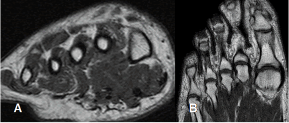 A: RM axial en T1 y B: RM sagital en T2. Ligamento hipointenso normal, entre el escafoides y el calcáneo.