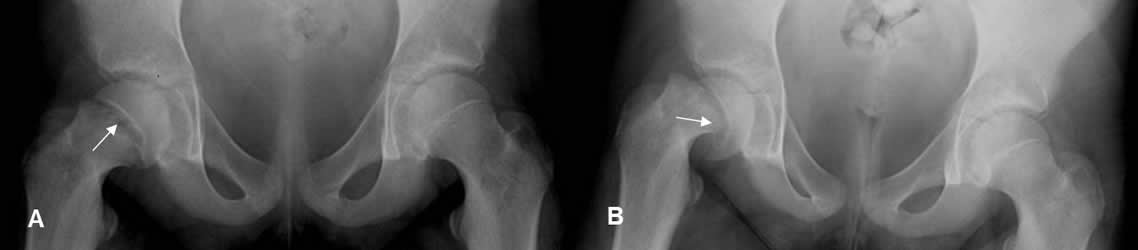 B: Rx AP de control. Desplazamiento medial del núcleo de crecimiento, en relación con el cuello femoral.