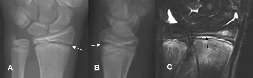 C: RM coronal en STIR. Edema óseo del radio y cúbito distal, por contusión. Líquido sobre la placa de crecimiento, por deslizamiento epifisiario tipo I. (Flecha negra).