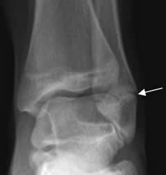Rx AP. Esclerosis e irregularidad en las placas de crecimiento del peroné, por cicatrización de lesión Salter tipo I.
