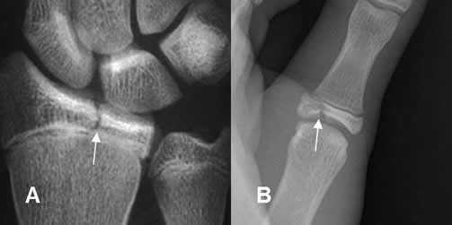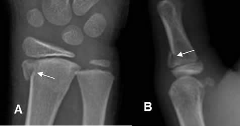 A y B: Rx AP. Fracturas verticales en las epífisis del radio y el dedo, por lesiones tipo III.