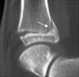 TAC reconstrucción sagital. Fractura en la placa de crecimiento, con extensión a la metáfisis tibial.