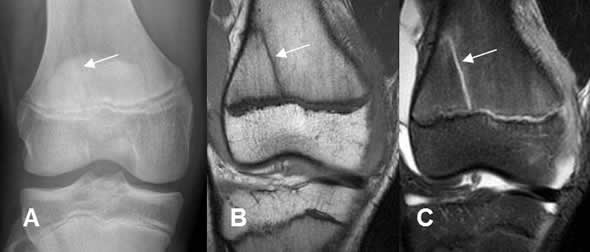 A: RM axial en T1, B: RM sagital en T1 y C: RM sagital en STRI. Fractura no desplazada y en sentido oblicuo, sobre la metafisis tibial, por deslizamiento epifisiario G II.