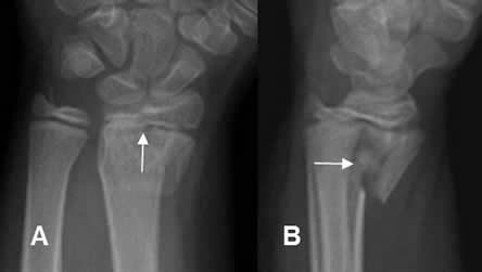 A: Rx AP y B: Rx lateral. Fractura lineal y en sentido vertical en la metáfisis del radio.