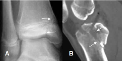 A: Rx AP y B: TAC reconstrucción sagital. Fracturas oblicuas con compromiso de las epífisis y metáfisis del tobillo y la rodilla.