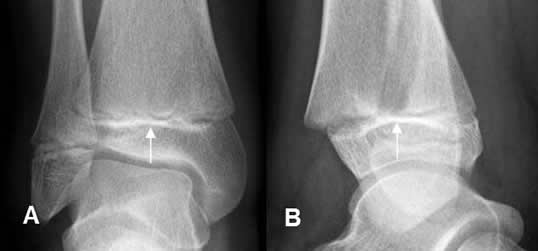 A: Rx AP y B: Rx lateral. Disminución del espacio en la placa de crecimiento y esclerosis asociada, en el seguimiento de un deslizamiento epifisiario tipo V.