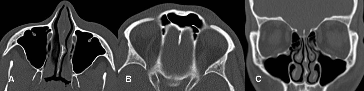 A y B: TAC reconstrucción coronal. Fractura lineal de la pirámide nasal izquierda en A y deprimida de la derecha en B. Adicionalmente hay múltiples fracturas orbitarias.