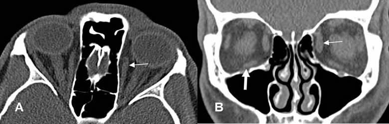 A: TAC axial y B: TAC reconstrucción coronal. Músculos recto interno (Flechas delgadas) y recto inferior (Flechas gruesas) normales. Ambos tienen forma ovalada.