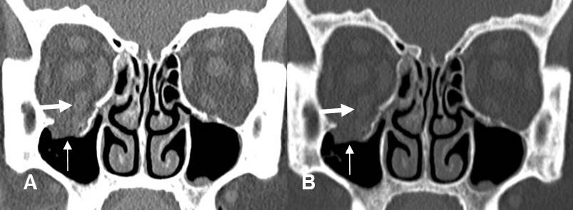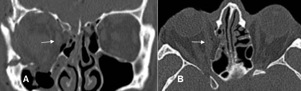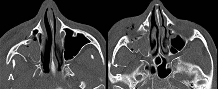 A y B: TAC axial. Fracturas en el piso y pared posterior del antro maxilar derecho.